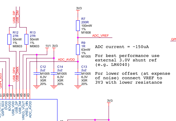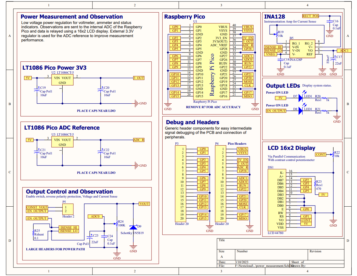 For this project, I did everything I could to isolate the ADC reference for the best possible readings. Essentially, I have added a separate 3.3 V linear regulator specifically for the ADC reference. To use this reference voltage without digital operation or SMPS noise, I have removed the R7 resistor that connects the Pico’s 3.3 V source to the ADC reference. This method heavily isolates the ADC reference. It is potentially overkill, but I was interested in seeing how the device would perform.