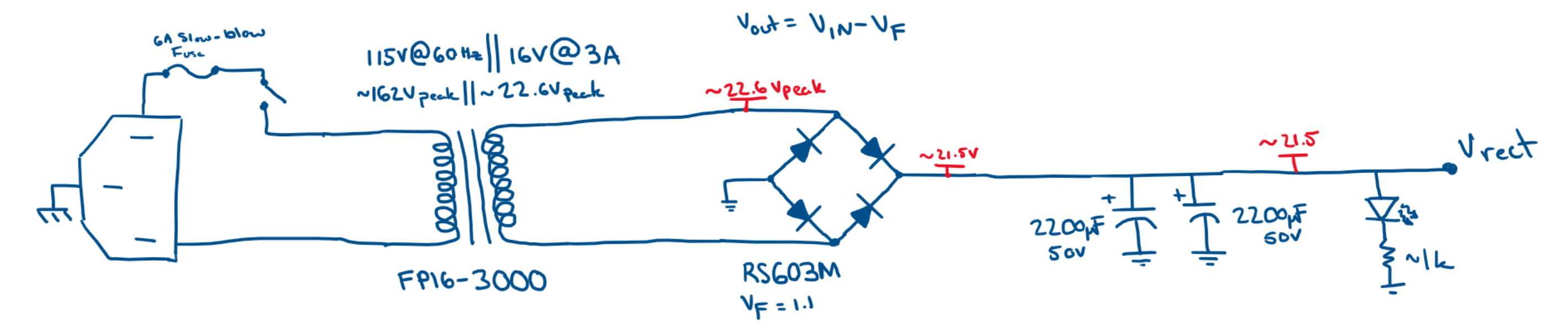 The circuit implements the general systems shown in the block diagram. From the AC outlet, a fuse and switch connect mains voltage to the device for operation. The Flat‑Pak 16 V transformer (FP16‑3000) can deliver 48 VA of power. This device is perhaps one of the most limiting factors of the supply. I anticipate 22.6 V peak‑to‑peak voltage from a 115 V AC circuit, which may not be enough for a 20 V output after regulation. This will be followed by an RS603M full bridge rectifier, with a forward voltage drop of 1.1 V. Two 2200 µF capacitors follow the rectifier for filtering, providing a raw DC voltage around 21.5 V to the following circuit stages.