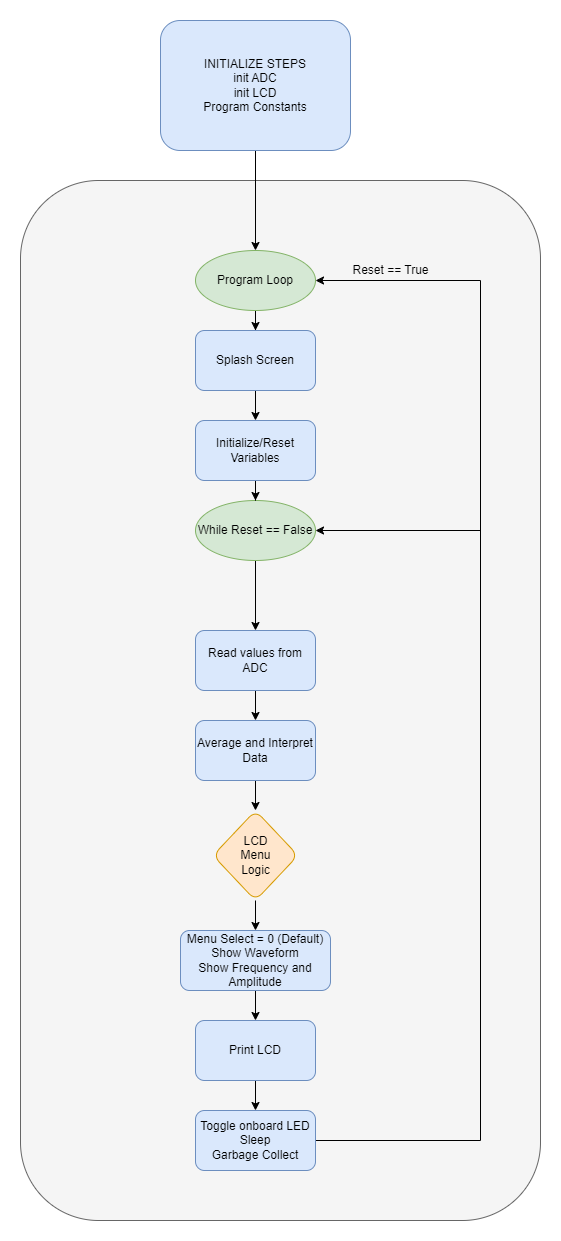 The Pico has a relatively simple program loop. A few systems such as the LCD and ADC are initialized on startup, then continuous readings from both ADC channels are taken for interpretation. Each channel has offset removed, becomes averaged over several samples, and scaled if necessary. Then the data is printed onto the LCD screen for interpretation. There are a few edge cases regarding the output being off, an open circuit, and a short circuit. In these situations, the LCD relays the situation to the user based on interpreted ADC data.