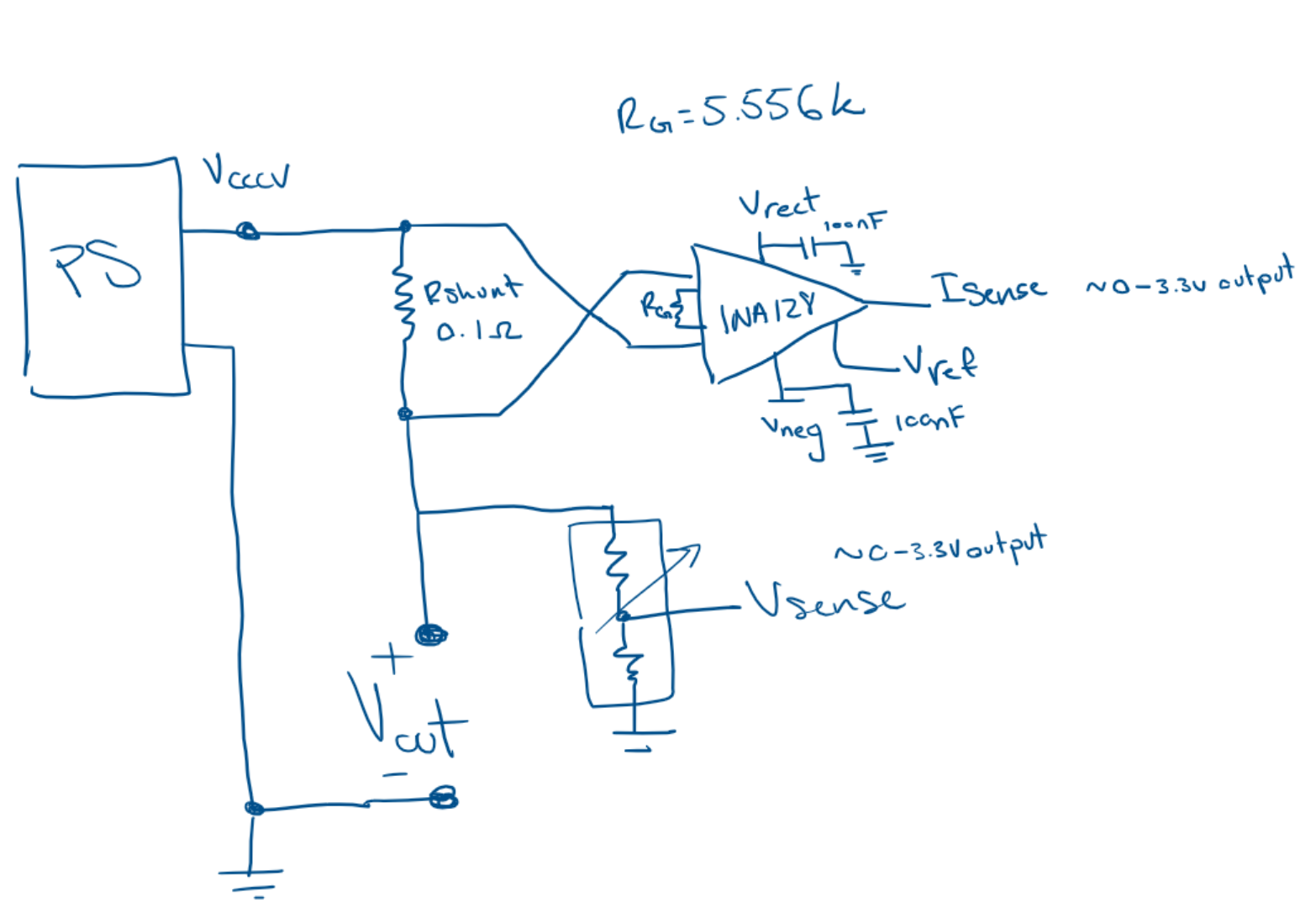 The output of the CCCV then feeds into the measurement circuitry for observation and user interaction. A 0.1 Ω shunt resistor is added for high‑side current sensing. This was done with the INA128 which should have no problem observing the dynamic range of the power supply. The current can be no more than 3 A as set by both the transformer and the regulators. This circuit observes currents in the full operation range and imposes minimal voltage loss on the output. A 100 W rated shunt is used for safety during a short‑circuit condition. A gain of 10 is applied to make the output voltage functionally equivalent to the observed current over the shunt resistor. This means that a 0–3 V output can easily be read by a 3.3 V ADC. The output voltage is observed through a resistor divider that similarly creates a 0–3 V output for ADC readings. The ratio of loss from the divider is inverted and applied back to the sensed ADC value in software to relay the correct output voltage.