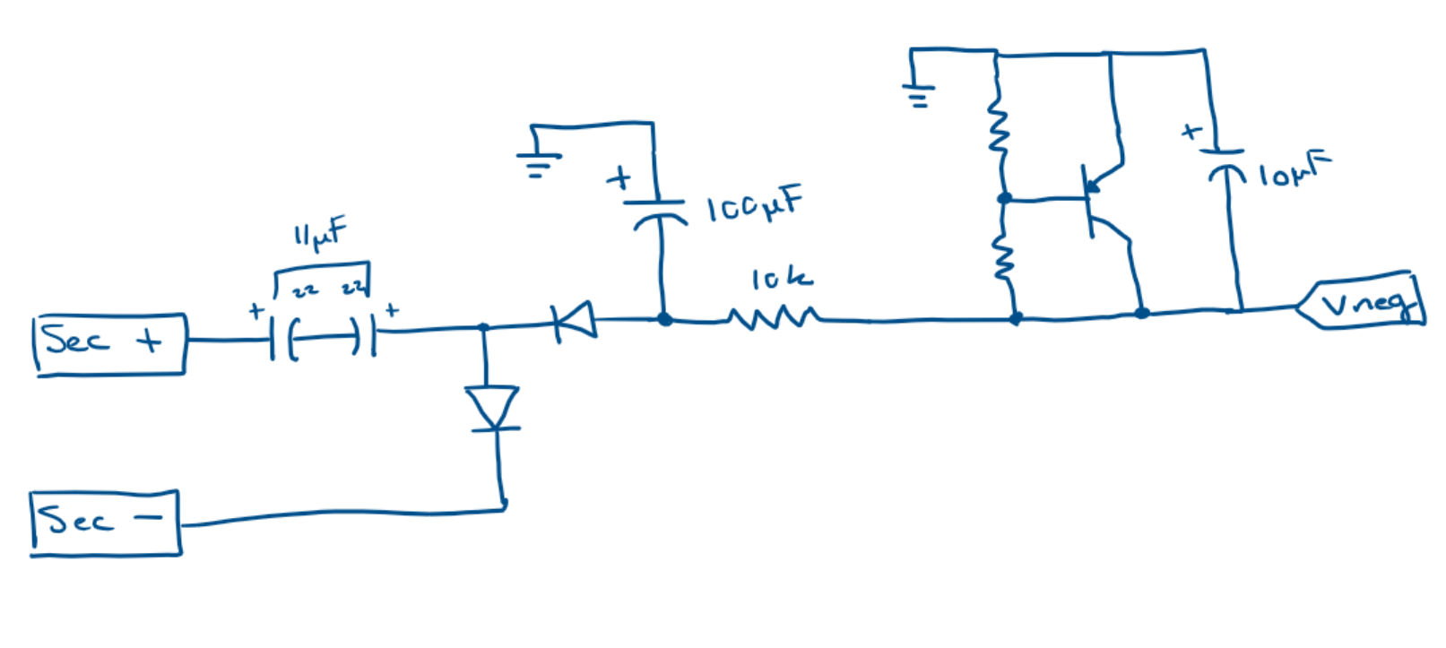 The INA128 used for current readings has a 36 V operation range and requires about 2 V of offset from each rail to operate effectively. The device will be supplied by both the rectified voltage and a negative reference voltage. This is because the rectified voltage should be approximately 2 to 3 V higher than the output of the voltage regulator, giving enough room for higher voltage measurements. However, the device must also output on the 0–3 V range. To do this effectively, a negative voltage reference must be made to supply an offset from the lower rail of operation. A negative voltage rail around –3 to –7 V is sufficient. This was done using a negative voltage charge pump that feeds a VBE multiplier, giving a nice output reference. The INA128 will only draw about 1 mA of current from this rail, so a charge pump is fine for this purpose.