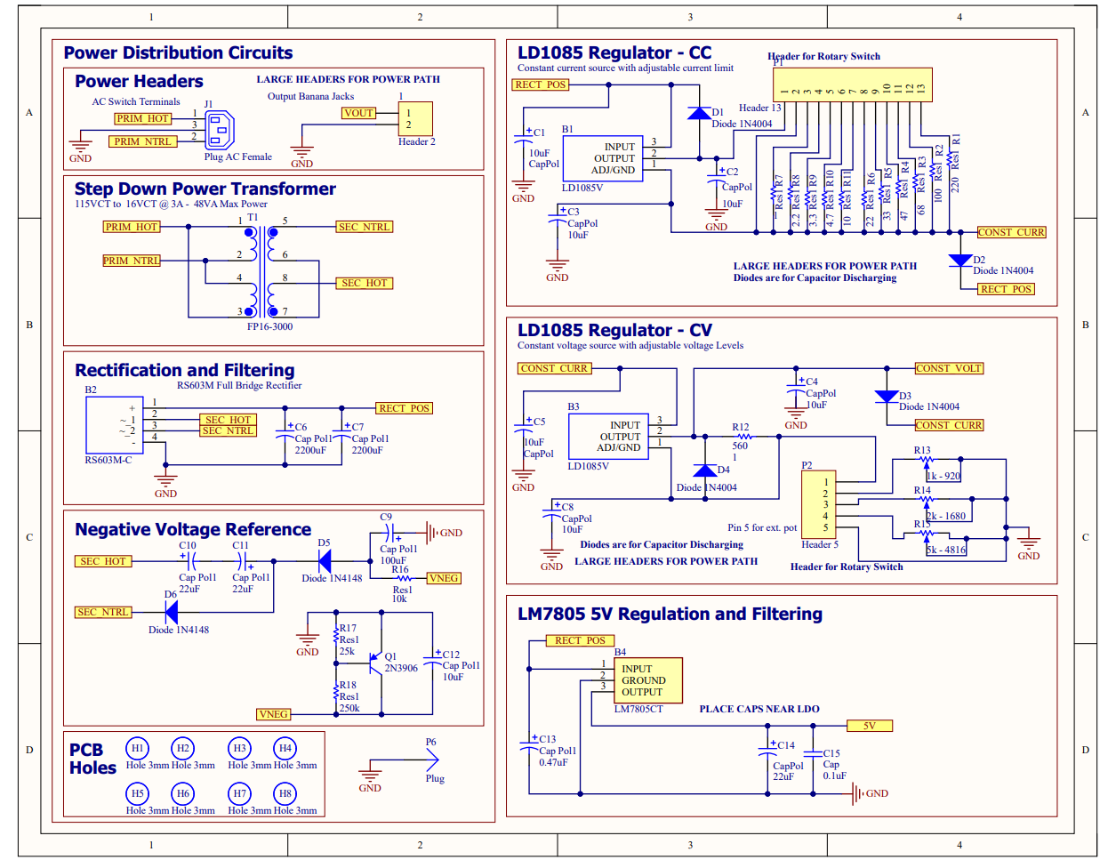 The purpose and goals of this project are to become familiar with linear power supply design, prepare engineers to transform, regulate, and rectify power for future projects, and create a critical tool for any engineer’s lab.