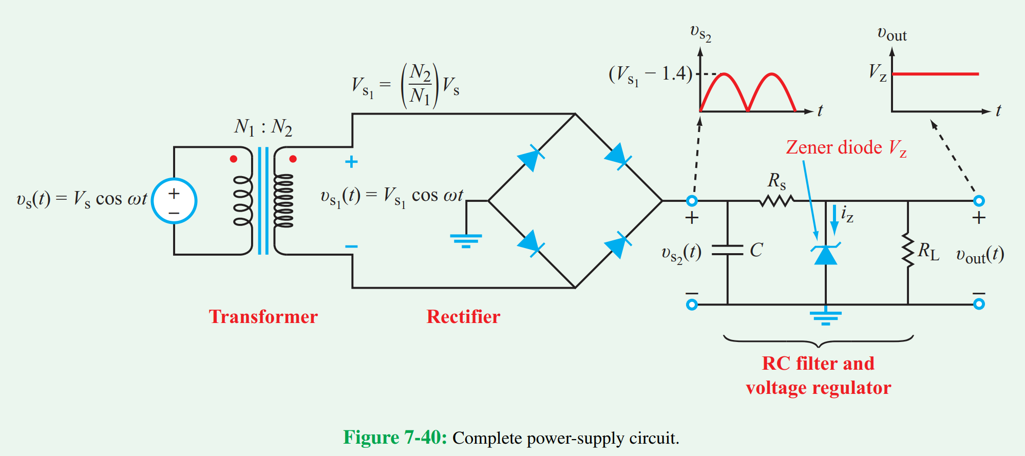 Fig 7-40 of Circuit Analysis and Design1. Complete circuit of a basic power supply using a zener diode regulator